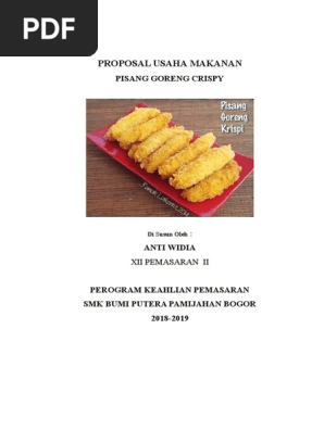 Contoh proposal usaha makanan dari pisang. Palu merupakan salah satu daerah di Indonesia dengan potensi. Menjelaskan secara terperinci contoh proposal keripik pisang. Tujuan dari pengembangan Proposal Usaha Piscok ini adalah memberikan nuansa yang berbeda kepada pecinta makanan bahwa di Indonesia memiliki beraneka ragam makanan yanglebih baik dari makanan bangsa asing sehingga mereka akan menghargai makanan hasilkreatifitas budaya nusantara dan meninggalkan makananmakanan cepat saji fastfood dan ini juga untuk melestarikan makanan khas nusantara sebagai ciri khas kebudayaan bangsa Indonesia dan mencegah dampak negatifnya makanan.