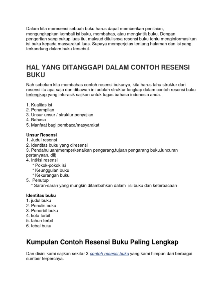 208 berikut ini adalah contoh resensi buku pengetahuan beserta unsursistematikastrukturnya dengan penyesuaian. Sinopsis Buku Fiksi. Dalam bahasa Belanda dikenal dengan recensie sedangkan dalam bahasa Inggris dikenal dengan istilah review.