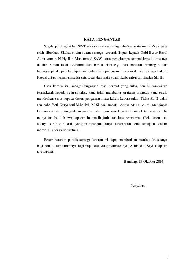 Mengambil surat pengantar dari Program Studi Fisika untuk institusi tempat KKL secepat-cepatnya 3 hari setelah pengumpulan proposal. Contoh Kata Pengantar Laporan Praktikum Fisika KATA PENGANTAR Puji syukur penulis panjatkan kehadiran Allah SWT atas segalah limpahan rahmat dan karunia-Nya sehingga penulis dapat menyelesaikan Laporan Praktikum Fisika Dasar II yang disusun berdasarkan pengalaman kuliah dan sumbangan pemikiran dari pembimbing dosen Fisika Dasar II dan beberapa teman. KATA PENGANTAR Program Kreativitas Mahasiswa P KM diluncurkan oleh Direktorat Jenderal Pendidikan Tinggi pada tahun 2001 yang merupakan integrasi dan sekaligus metaforfosis dari berbagai jenis kompetisi mahasiswa bidang penalaran atau karya ilmiah yang ada saat itu.