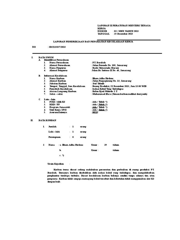 50 Tahun JENIS KELAMIN. A Perbuatan yang berbahaya unsafe acts B Faktor Manusia personal factor 1. Contoh Laporan Investigasi Guru Paud Cute766.