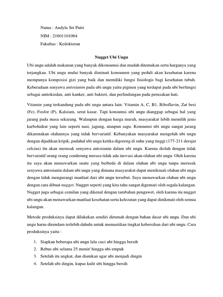 Jenis usaha merupakan UKM Usaha Kecil Menengah yang memproduksi makanan ringan yang lezat dan menyehatkan berbahan dasar ubi dengan cita rasa yang khas berupa kue Bronies Ubi. Mereka lebih suka makan daging ayam dalam segala olahan termasuk nugget. View Contoh_Proposal_ubi11doc from COM MISC at SMA Negeri 4 Bekasi.