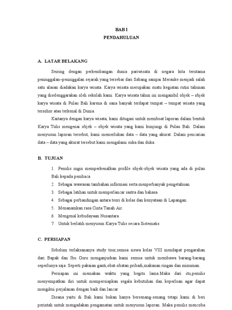 Contoh sistematika penulisan laporan study tour. Dalam penyusunan karya tulis ini siswa diharapkan dapat melaporkan segala pengetahuan dan pengalamannya yang diperoleh selama menjalankan Study tour selama 3. KE MUSEUM ULLEN SENTALU KALIURANG SLEMAN. BAB I Pendahuluan terdiri atas latar belakang tujuan penulisan laporan obyek-obyek yang diamati Metode penulisan laporan.