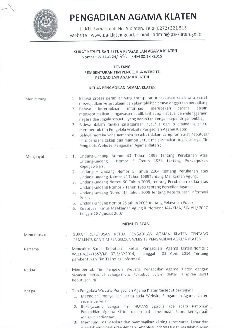 Adminpa-klatengoid SURAT KEPUTUSAN KETUA PENGADILAN AGAMA KLATEN Nomor. Bahwa pengelolaan website Kabupaten Bulungan dilaksanakan Bagian Humas dan Protokol maka dalam rangka kesinambungan pengelolaan website dimaksud dipadang perlu dibentuk tim pengelola. Pengelola Jurnal Tugas Akhir Mahasiswa S-1 terdiri dari Pimpinan Redaksi Web Developer dan Web Admin yang diangkat melalui SK Rektor dan dibiayai dengan pagu dari UPTPerpustakaan.