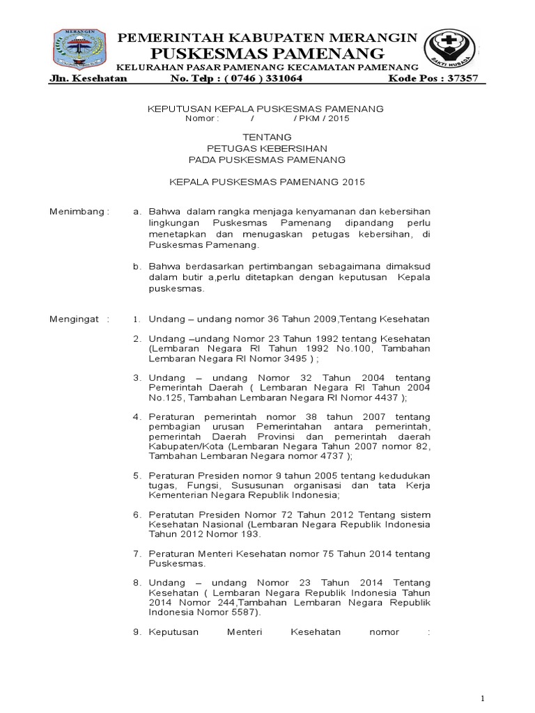 812 2015TENTANGTIM PENGAWAS DAN PETUGAS KEBERSIHANPADA UPTD PUSKESMAS DOMPU KOTATAHUN 2015Menimbang. Dalam contoh SK berikut ini adalah petugas yang merangkap 3 tugas sekaligus. KEPUTUSAN KEPALA UPTD PUSKESMAS DOMPU KOTA.