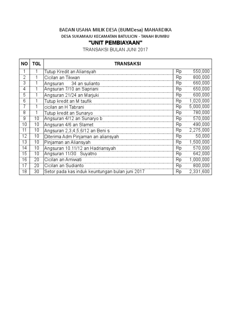 Semoga penjelasan contoh format yang Kami berikan dapat bermanfaat untuk Anda. Memberikan laporan perkembangan unit. Membuat laporan keuangan seluruh unit-unit usaha BUM Desa setiap bulan.