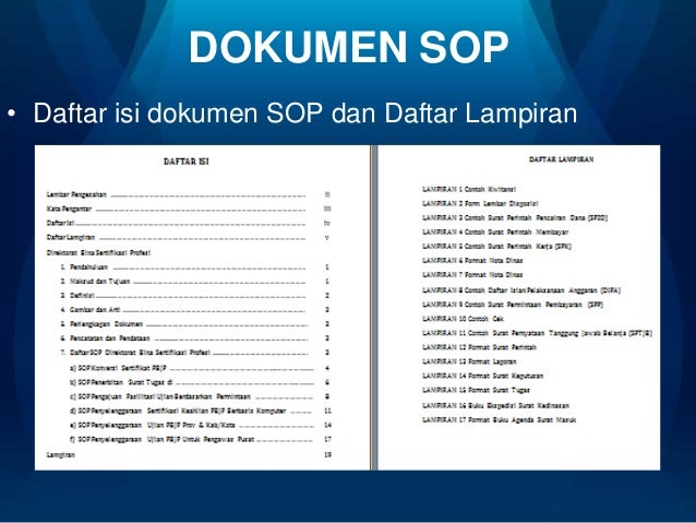 Contoh daftar isi sop. SOP001WM2016 Tentang SOP Audit Internal Tata Usaha Negara Bandung 4. SOP001WM2016 Tentang SOP Pengendalian Layanan Tidak Sesuai Tata Usaha Negara Bandung. Nomor 100 199 SOP pengelolaan dan penyaluran produk.