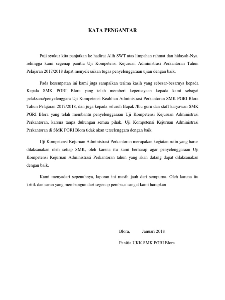 Kata Pengantar Laporan Pkl Untuk mahasiswa serta pelajar membuat sebuah kata pengantar bagi tugas laporan ialah hal yang begitu penting. Kata pengantar proposal usaha seyogyanya berfungsi sebagai pengantar pembaca kepada isi maupun uraian yang ada dalam proposal usaha tersebut.
