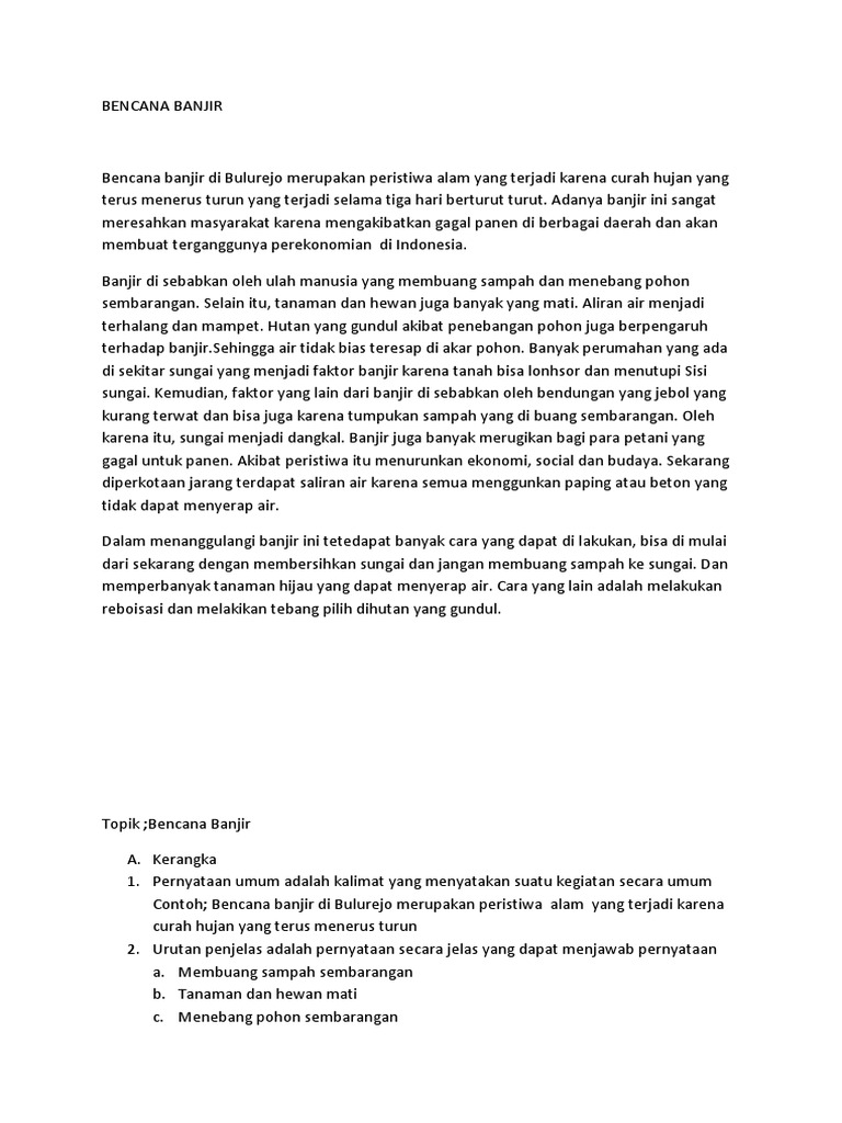 Jadi ketika suatu wilayah kekurangan pohon maka kekeringan bisa terjadi. Contoh teks eksplanasi banjir Contoh 1. Buatlah kerangka karangan berdasarkan struktur teks eksplanasi yaitu identifikasi fenomena penggambaran rangkaian kejadian dan ulasan.