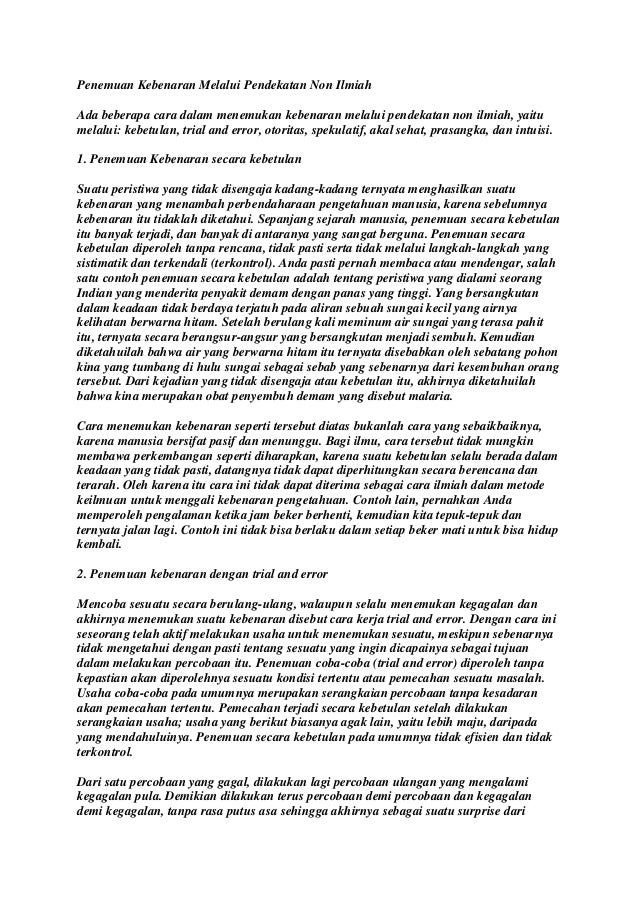 Bersifat untung-untungan Melalui Otoritas Melalui Otoritas kebenaran bisa didapat melaluikebenaran bisa didapat melalui otoritas. Lain halnya dalam ilmu sosial dan psikologi kebenaran akan sebuah temuan akan lebih relatif sebab fenomena sosial yang terjadi disebabkan oleh banyak faktor misalnya budaya nilai - nilai value bahkan perkembangan teknologi. Contoh Galileo dapat dianggap tokoh perintis ilmu pengetahuan khususnya IPA karena ia berani menentang kepercayaan yang ada pada masa itu yang berlawanan dari hasil pengamatannya.