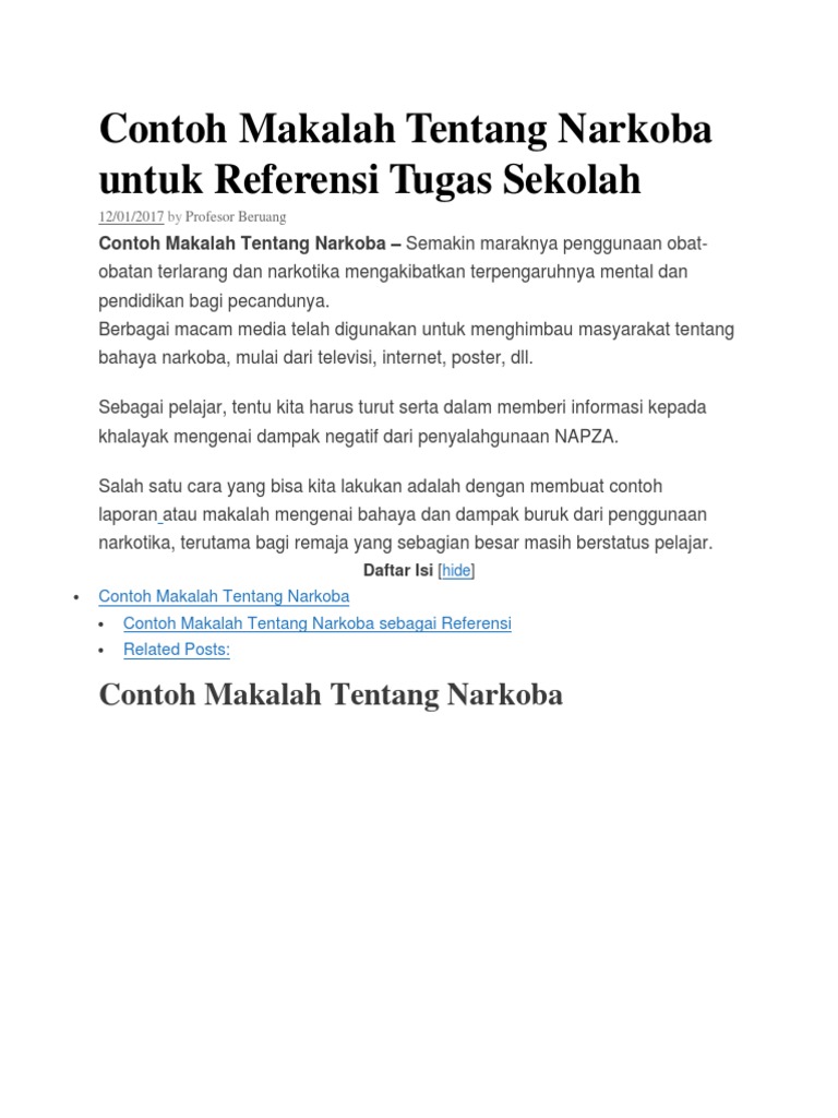 Contoh Makalah Bahaya Narkoba. Contoh Makalah Singkat Lengkap dan Jelas Tentang Narkoba pdf dampaknya penjas academia cover 29 Jan 2017 1 comment Kumpulan contoh struktur makalah penelitian untuk mahasiswa-sma-smp lengkap. Diharapkan setelah penulis menyusun makalah ini masyarakat sadar akan bahayanya mengkonsumsi narkoba dan menyalah gunakan narkoba.