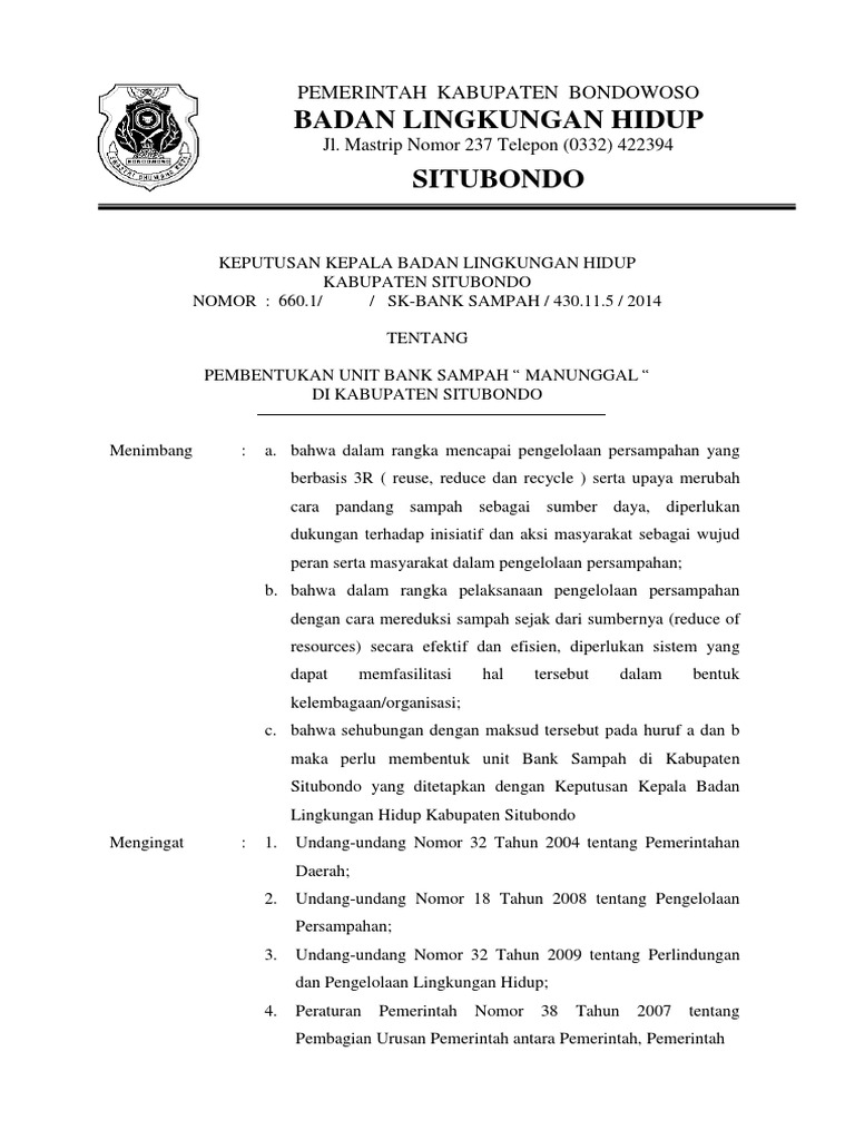 KEPUTUSAN WALIKOTA METRO NOMOR. Contoh sk bank sampah by antika 84. Sampah kering yang dihasilkan kebanyakan berupa kertas plastik dan sedikit logam.