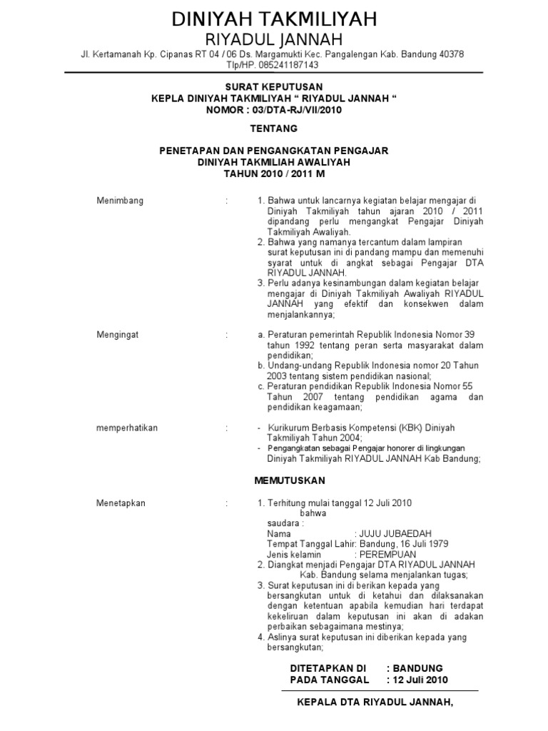 03DTA-RJVII2010 TENTANG PENETAPAN DAN PENGANGKATAN PENGAJAR DINIYAH TAKMILIAH AWALIYAH TAHUN 2010 2011 M Menimbang. Surat keputusan ini bisa digunakan untuk sd smp dan smasmk maupun madrasah. Hasil Musyawarah Kepala Madrasah dengan Dewan Pembina Madrasah Diniyah Awaliyah Al-IKHLAS tanggal 25 januari 2006 tentang Penunjukan penetapan dan pembagian tugas mengajar guru di Madrasah Diniyah Awliyah Al- IKHLAS Seuat Masjid Seuat Jaya Petir.
