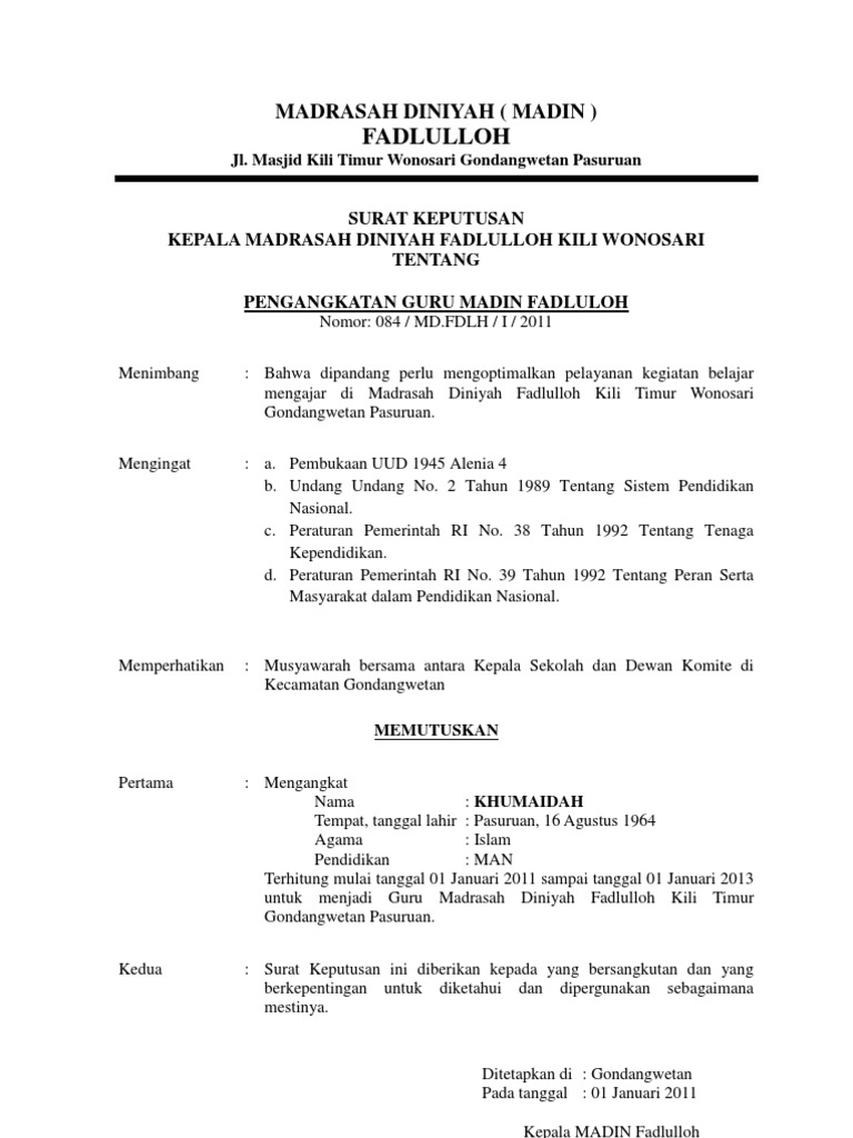 Contoh Sk Pengangkatan Kepala Sekolah Madrasah Oleh Cute766. Doc Susunan Pengurus Nadhir Dan Yayasan Lilik Thoyyibah Academia Edu. O2YPSD-IUVII2015 TENTANG PENGANGKATAN GURU MADRASAH DINIYAH BAITURROHMAN TAHUN PELAJARAN 20152016 KETUA YAYASAN PENDIDIKAN SOSIAL DAN DAKWAH ISHLAHUL UMMAH Menimbang.