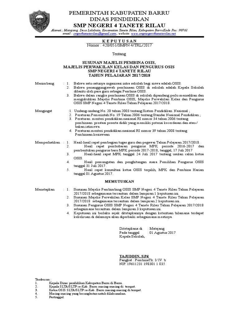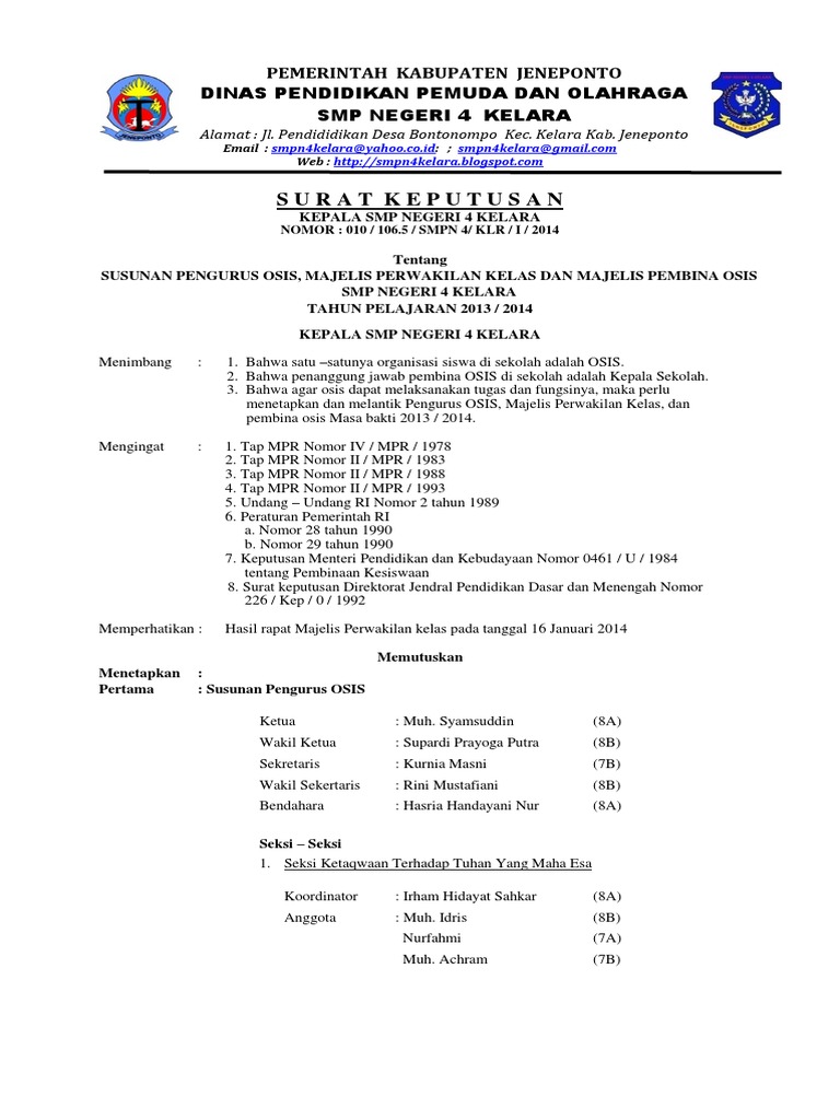 Contoh sk pengurus osis. BBahwa agar pelaksanaan tugas OSIS dapat berjalan dengan baik diperlukan dasar pelaksanakan. Bahwa satau satunya Organisasi secara intern yang ada di SMK TIRTAYASA Ciracap adalah OSIS.