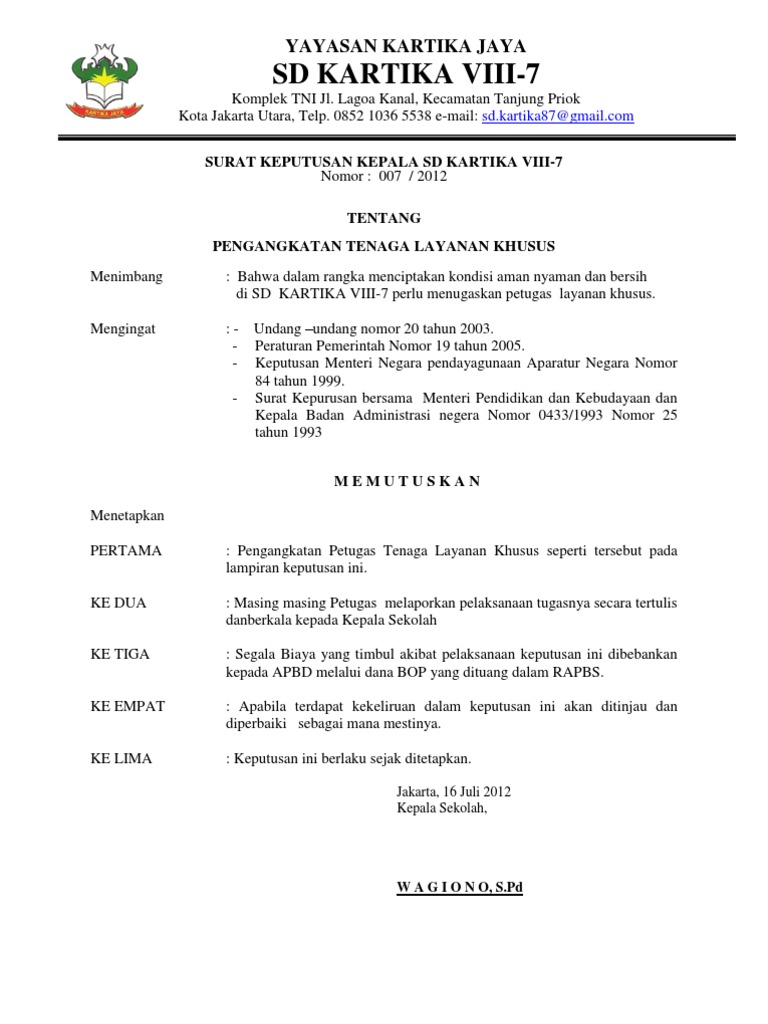 Kumpulan Contoh Surat Keputusan SK Kepala Sekolah Lengkap 03 Feb 2016 4 komentar Surat Keputusan atau yang biasa lebih dikenal dengan SK merupakan sebuah surat pernyataan yang dikeluarkan oleh lembaga tertentu formal maupun non formal yang berisi suatu kebijakan atau keputusan tertentu yang berhubungan dengan lembaga tersebut. Contoh Surat Keputusan Kepala Sekolah Surat Keputusan atau SK adalah sebuah surat pernyataan yang di keluarkan oleh lembaga yang berisikan suatu kebijakan atau ketentuan yang bersangkutan dengan lembaga tertentu misalkan Sekolah Perusahaan DLL. SK Pengjaga Sekolah ini dapat juga digunakan untuk SK Petugas Kebersihan Sekolah SK Pengangkatan Satpam Keamanan Sekolah atau jabatan sejenisnya seperti tukang kebun sekolah pesuruh sekolah dll.