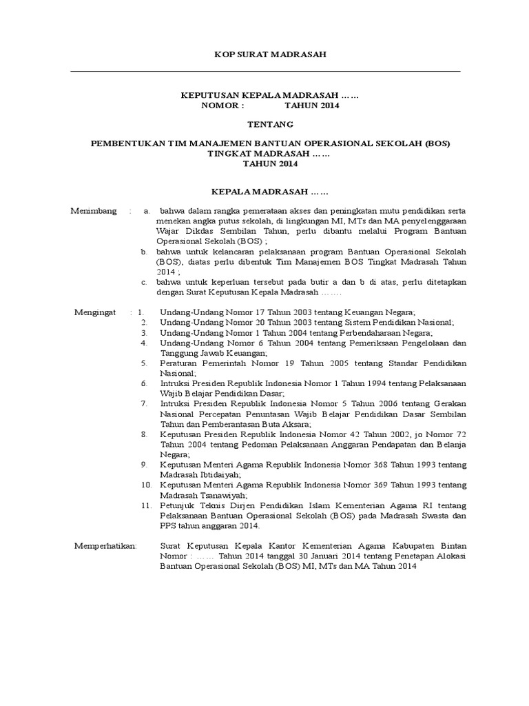 Contoh Sk Tim Manajemen Bos Tk Madrasah
