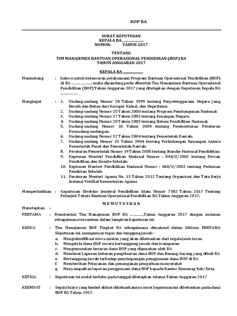 Contoh SK Tim BOS Reguler Sekolah Terbaru 2021 Format Word Untuk mengelola dana BOS yang diterima lembaga kepala sekolah wajib membuat SK TIM BOS. Contoh SK Pengangkatan Guru PAUD TKKBTPASPS Download Contoh Surat Keputusan SK Pengangkatan Tenaga Pendidik dan Kependidikan PAUD. 40 Lampiran 7 Contoh Berita Acara Verifikasi 42 vi Lampiran 8 Contoh SK Penetapan Satuan Penerima Dana.