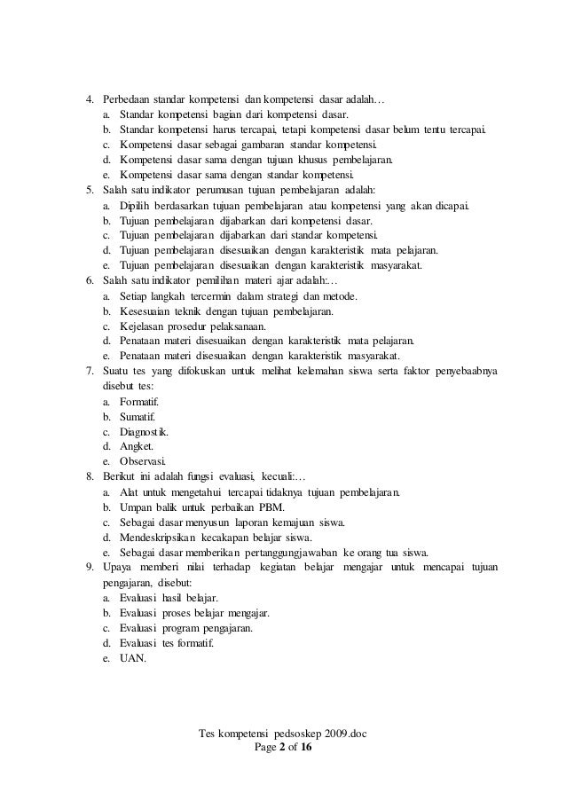 Kumpulan Tes kompetensi pedagogik kepribadian dan sosialdoc Page 1 of 14 TES KOMPETENSI PRA PPLT PROGRAM S1 KEPENDIDIKAN UNIVERSITAS NEGERI MEDAN Petunjuk. Tes kompetensi pedsoskep 2009doc Page 1 of 16 TES KOMPETENSI PRA PPLT UNIMED 2009 PROGRAM S1 KEPENDIDIKAN UNIMED KODE NASKAH PEDASOSKEP Petunjuk untuk Pilihan Berganda. Representasi dari kemampuan yang dimiliki.