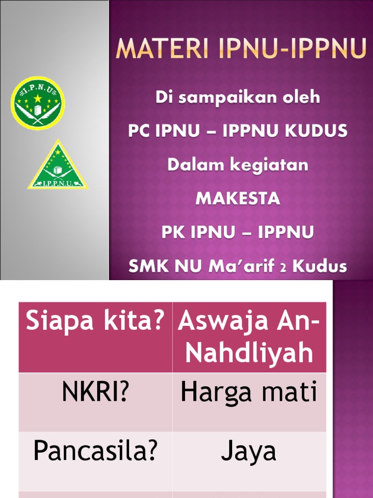 Download materi ipnu ippnu ppt. By Alfa Rezky Ramadhan. Theyll give your presentations a professional memorable appearance - the kind of sophisticated look that todays audiences expect. Pimpinan Cabang Ikatan Pelajar Nahdlatul Ulama IPNU dan Ikatan Pelajar Puteri Nahdlatul Ulama IPPNU Kota Kraksaan Proboinggo Jawa Timur mengadakan RTL Rencana Tindak Lanjut Alumni Diklatama Pendidikan dan Pelatihan Pertama dan Lakmud Latihan Kader Muda di obyek wisata Pantai Duta Desa Randutatah Kecamatan Paiton Kabupaten Probolinggo Ahad 268.