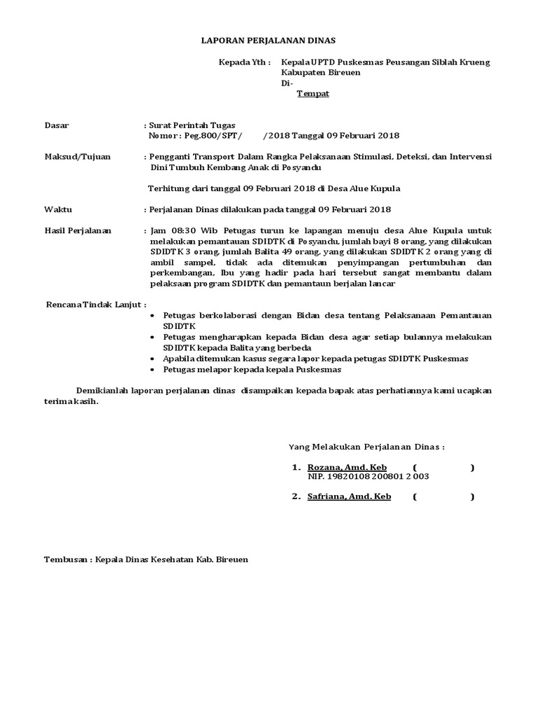 Laporan Perjalanan Dinas adalah laporan yang wajib dibuat oleh pelaksana perjalanan dinas setelah selesai melaksanakan kegiatan perjalanan dinas. Rapat Koordinasi Pusat Unggulan Iptek Tahun 2018. Jika perusahaan atau instansi tempat anda bekerja sudah memiliki format baku laporan perjalanan dinas maka anda tidak perlu repot-repot untuk mendesain format laporan.