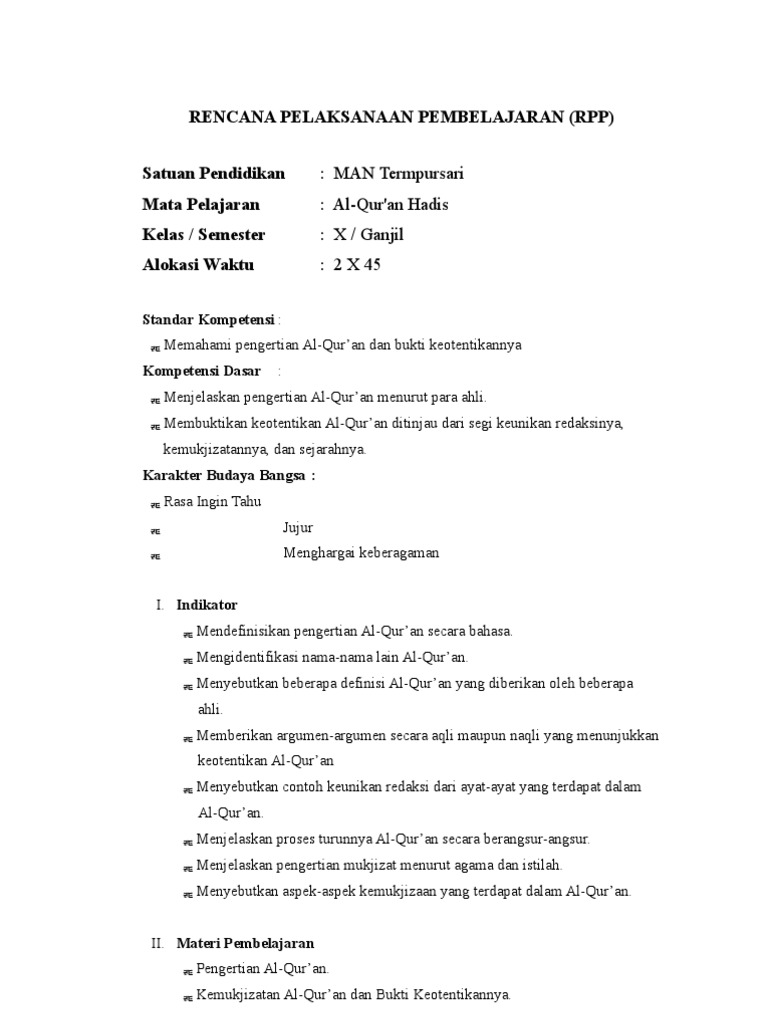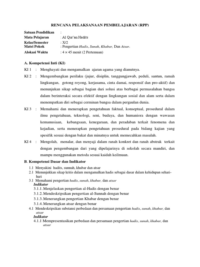 Rpp Al Quran Hadis Kelas X Ma Kurikulum 2013