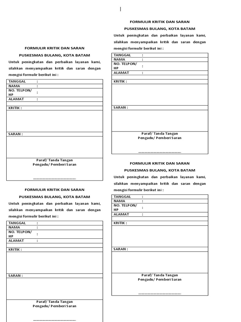 Downloadas DOCX PDF TXT or read online from Scribd. Contoh Formulir Kritik Dan Saran. BapakIbuSaudara Dosen Tenaga Kependidikan Mahasiswa dan Masyarakat sebagai bentuk kepedulian BapakIbuSaudara terhadap kemajuan IAIN Ponorogo khususnya pada Lembaga Penjaminan Mutu IAIN Ponorogo kami persilakan untuk mengisi formulir kritik dan saran berikut.
