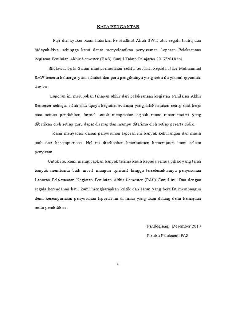 Laporan PertanggungJawaban LPJ ini ditunjukan kepada panitia penyelenggara kegiatan UAS tahun pelajaran. Kata Pengantar Laporan Sangat penting bagi siswa atau mahasiswa untuk membuat kata pengantar untuk tugas laporan. Puji dan syukur penulis panjatkan kepada Tuhan Yang Maha Esa atas usainya makalah yang berjudul Contoh Kata Pengantar Makalah Singkat.