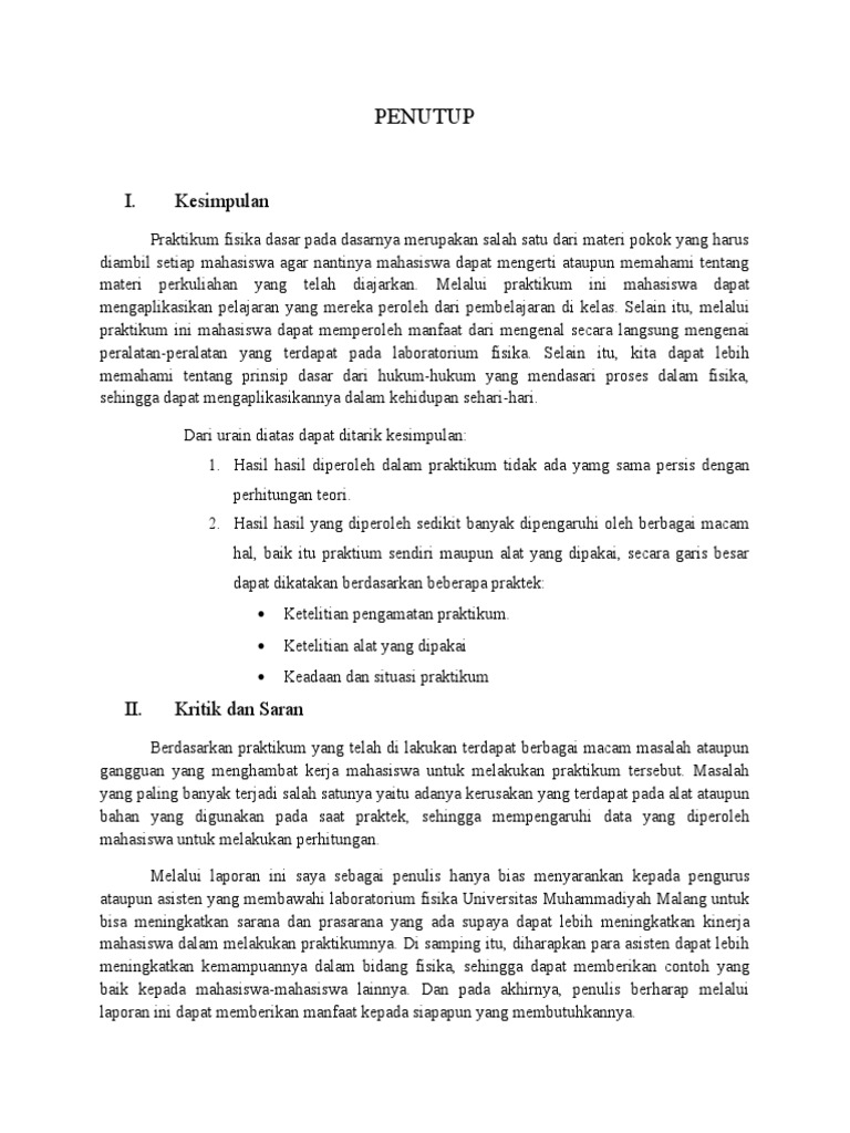 Laporan praktikum fisika dasar 1 pengukuran. Dari praktikum yang telah dilakukan dan mengacu pada rumusan masalah yang telah dibuat maka didapat kesimpulan sebagai berikut. Contoh Kesimpulan dan Saran 3.