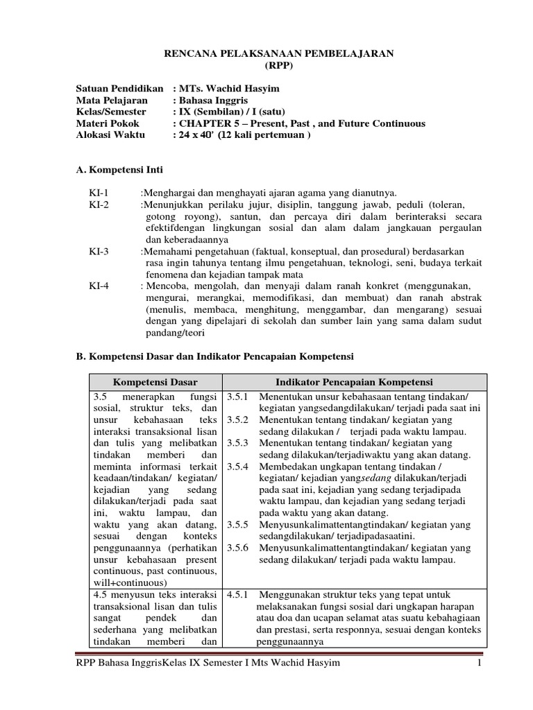 Rpp Bahasa Inggris Kelas 9 Smp Mts Semester 1 Materi Present Past Future Continuous