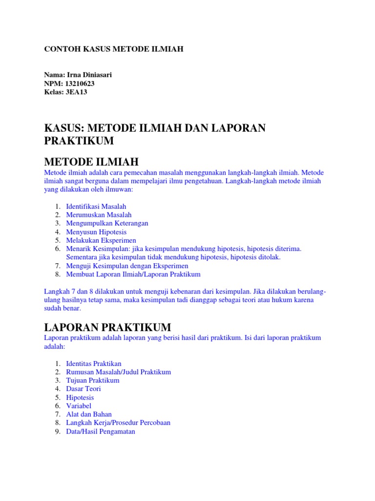 Identifikasi Masalah Merumuskan Masalah Mengumpulkan Keterangan Menyusun Hipotesis Melakukan Eksperimen Menarik Kesimpulan. Contoh Laporan Praktikum Metode Ilmiah.