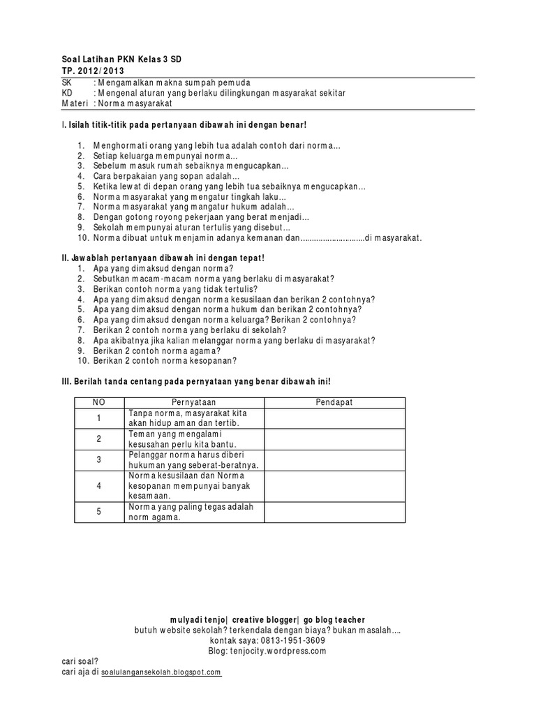 Soal Pkn Kelas 3 Sd Semester 1 Tentang Norma Guru Galeri
